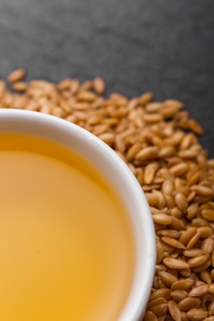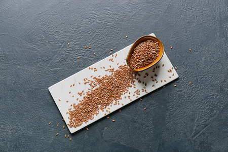 seeds of golden flax on a dark stone background