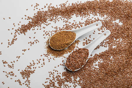 Close up Flax seeds in a wooden spoon. Composition with, flax seeds, and plants on white background. Organic Healthy food background.
