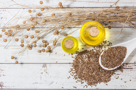 Seed flowers and flax oil bottles on white wood