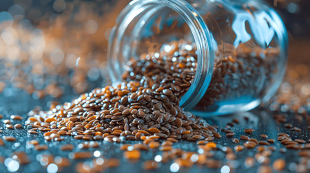 Glass Jar of Flax Seeds Spilling Over on a Reflective Surface - Concept of Nutrition, Healthy Eating, Seed Storage, and Organic Food.