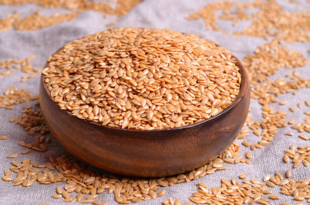 Yellow flax seeds in a wooden dish on a textile background. Selective focus.
