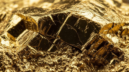 A detailed, macro close-up showcases the rough, jagged surface of a gold nugget. The natural, unrefined form of the precious metal is evident, with numerous sparkling facets catching the light and reflecting a golden hue. The texture is varied, with crystalline structures and rougher, earthy areas visible. highlights the raw beauty and inherent value of gold, themes related to wealth, luxury, investment, geology, or as an abstract representation of precious resources.