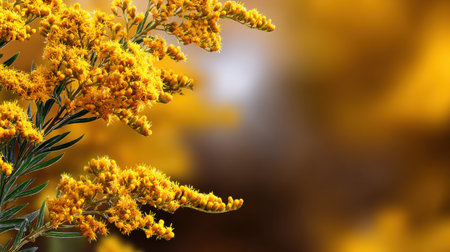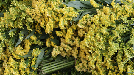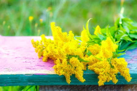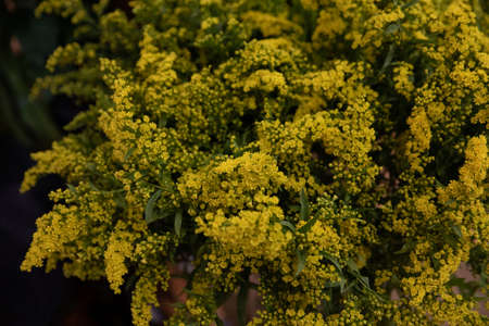 Beautiful bouquet of Solidago or goldenrod flowers in autumn. Horizontal.