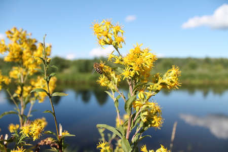 Bee on yellow flowers closeup on a background of river and forest
