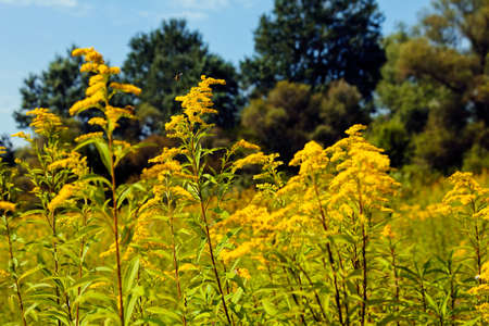 Yellow flowers of goldenrod. Weed culture grows in the field.