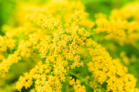 Canadian goldenrod, cluster of small yellow flower heads, close up. Solidago canadensis or brendiae is an ornamental perennial herb, herbaceous flowering plant of the family Asteraceae, Compositae.