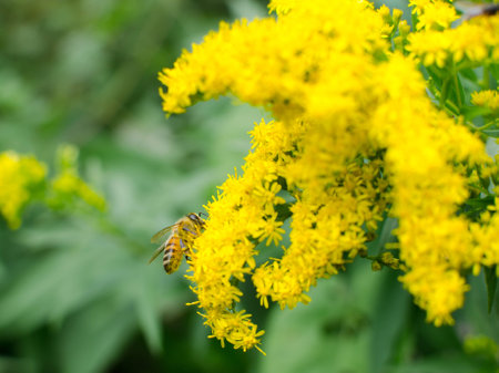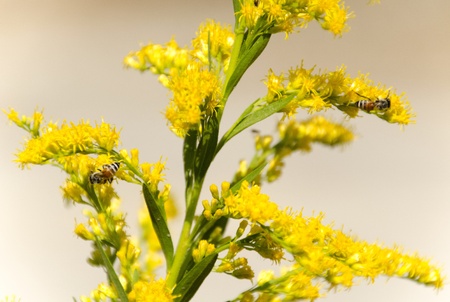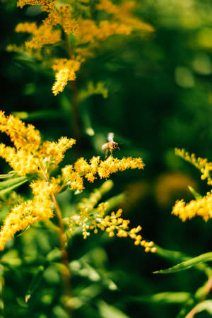 Bee on goldenrod flower in nature. Goldenrod is a perennial plant.