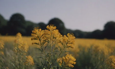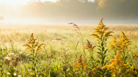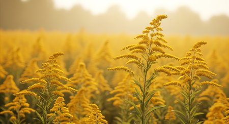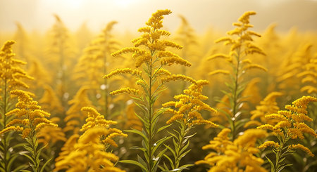 A vibrant field of goldenrod plants stands tall, illuminated by the soft, golden glow of the morning sun, creating a serene and natural landscape.
