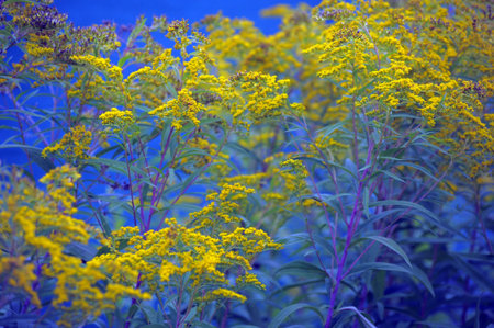 A dense, overgrown field of goldenrod with bright yellow flowers against a rich blue background. The contrast between the bright yellow flowers and the deep blue background creates a dramatic, painterly composition. The stems of the plant have green leaves and slightly purple hues on the stems. The image is done in an artistic style, with an emphasis on the play of color and light, making it suitable for use in design, illustrations and nature themes.