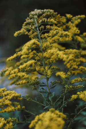 Yellow autumn goldenrod flowers in field on dark green blurred grass steam background