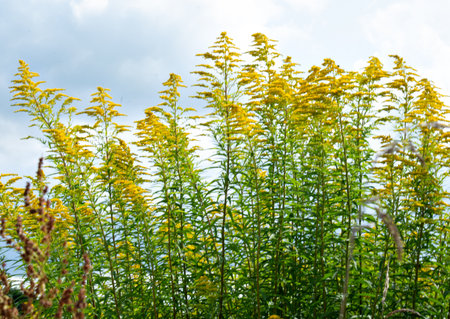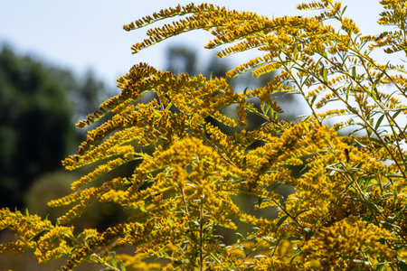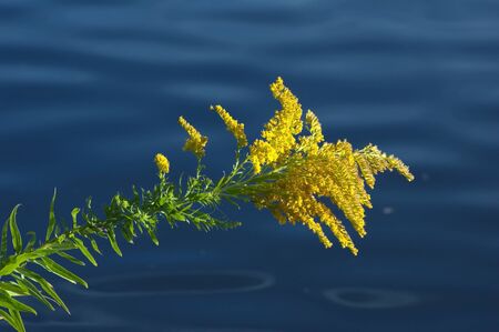 Solidago Virga Aurea. Close-up against the blue sky. The concept of harm and benefit of a plant