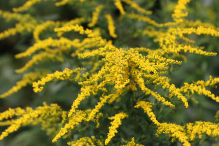 Yellow goldenrod flowers in summer park. Solidago plant.