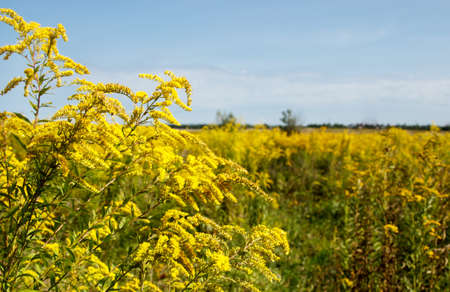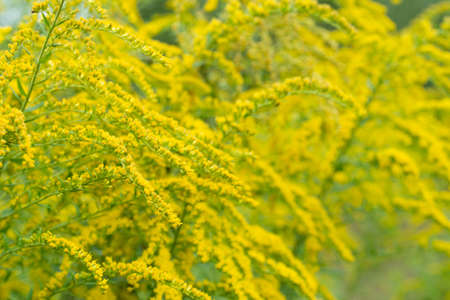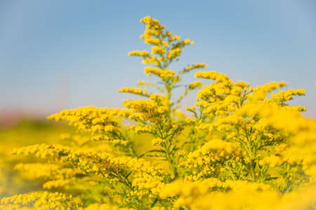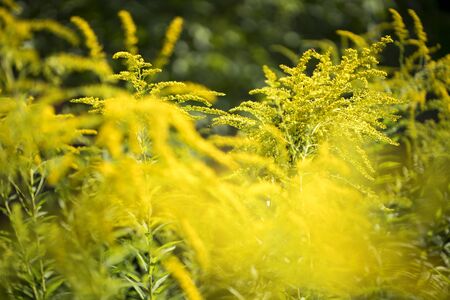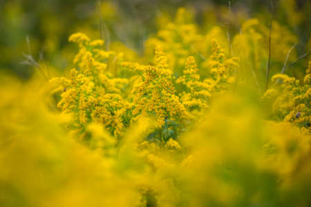 Yellow flowers of goldenrod. Weed culture grows in the field.