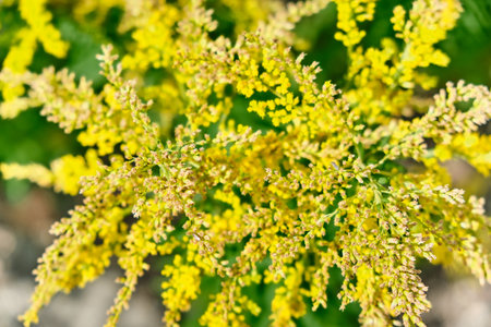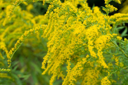 Goldenrod, cluster of small yellow flower heads, close up. Solidago canadensis is an ornamental perennial herb, herbaceous flowering plant of the family Asteraceae, Compositae.