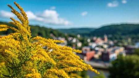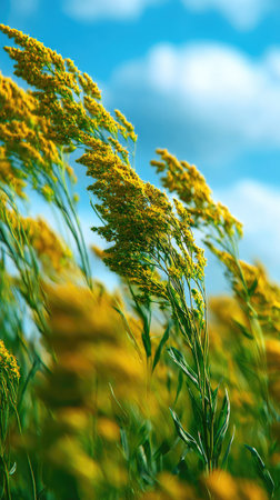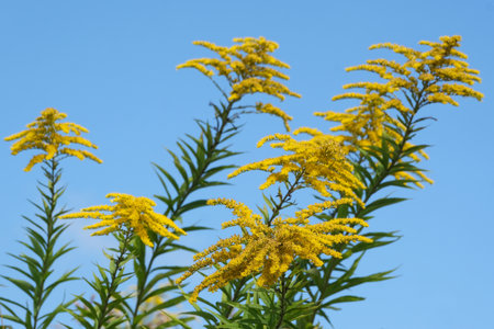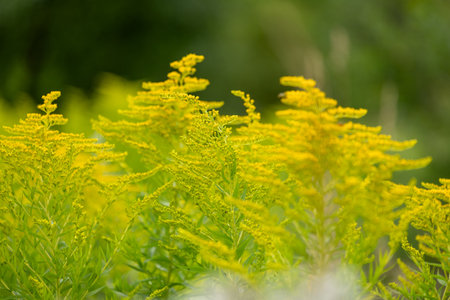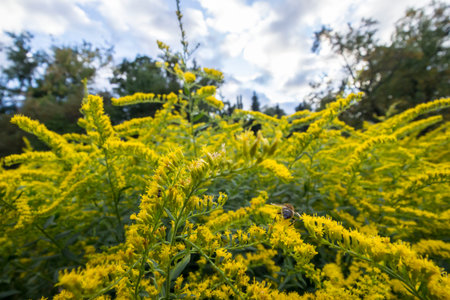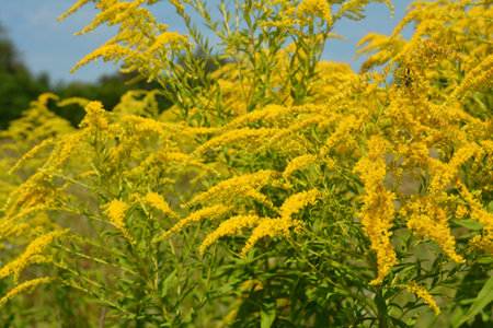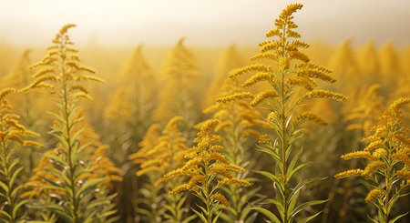 Goldenrod Solidago fills the scene with rich yellow blossoms. Dense clusters create a bright summer meadow view.