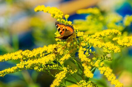 flower of Solidago commonly called goldenrods comes from North America including Mexico native to South America and Eurasia Butterfly Vanessa atalanta the red admiral or previously the red admirable