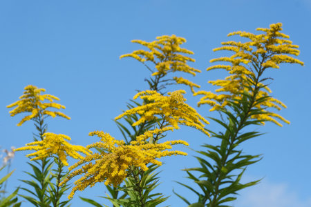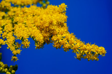 Yellow flowers of Solidago virgaurea (European goldenrod or woundwort) on blue sky background. It is a medicinal and decorative plant.