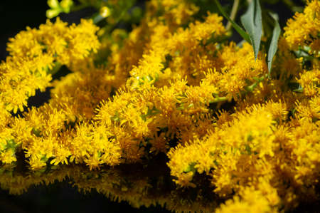 Canadian goldenrod, cluster of small yellow flower heads, close up. Solidago canadensis or brendiae is an ornamental perennial herb, herbaceous flowering plant of the family Asteraceae, Compositae.