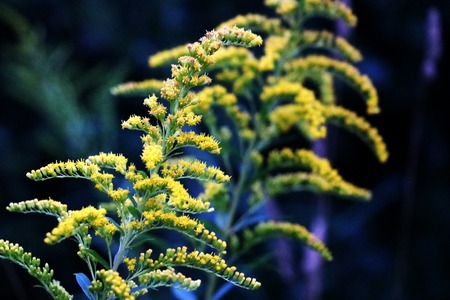 Beautiful Blooming Goldenrod Yellow Flowers Close Up Picture With Evening Sunset Light And Dark Green Blurry Background