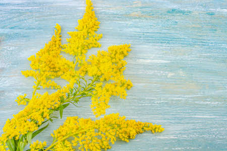 Goldenrod medicinal plant with yellow flowers on wood table. Fresh herbs on wooden background. Top view. Selective focus. Natural floral frame