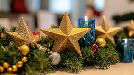 A Christmas table centerpiece with a candle, decorated with gold and silver stars, pastel colors, blue glass candles, and a white wooden background. A garland of golden beads surrounds the central stand. --chaos 30 --ar 16:9 --v 6.1 Job ID: db59b575-8475-4d78-a9b5-e90177e540db