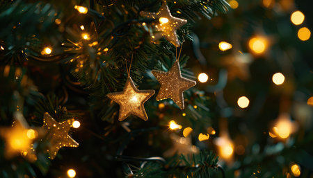A festive scene with golden star ornaments hanging from a Christmas tree with twinkling fairy lights