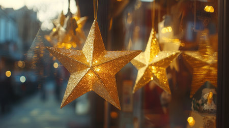 A captivating scene featuring golden stars gracefully hanging from a window display, creating a warm and inviting holiday ambiance. The soft bokeh adds a magical touch.
