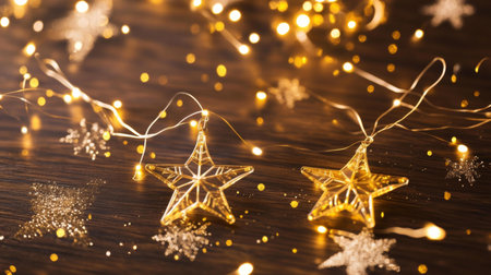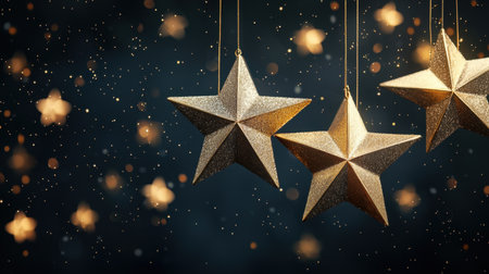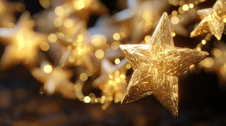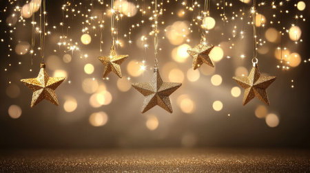 A stunning visual of golden star decorations hanging against a soft, shimmering bokeh background, perfect for capturing the essence of festive cheer and celebration.
