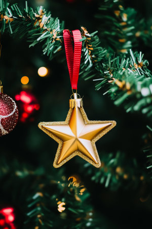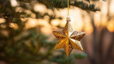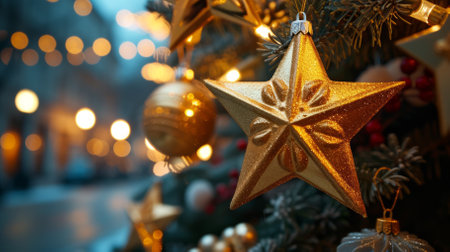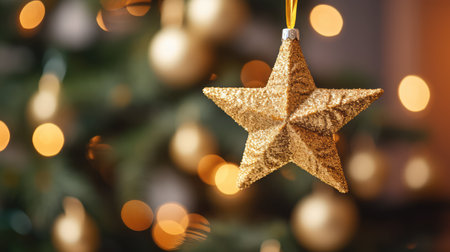 A close-up shot of a golden star ornament adorning a Christmas tree. Blurry, warm bokeh lights create a magical atmosphere, perfect for capturing the spirit of the holiday season.