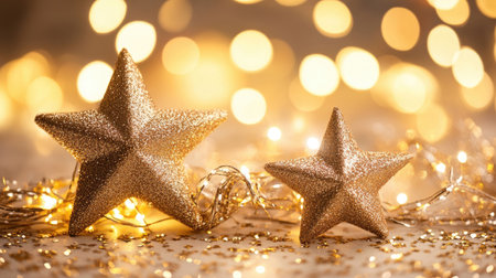 Enchanting golden stars twinkling with bokeh lights create a magical atmosphere for winter celebrations. Perfect for festive decorations and holiday themes.