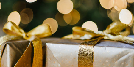 Gift boxes with golden ribbons on bokeh background.