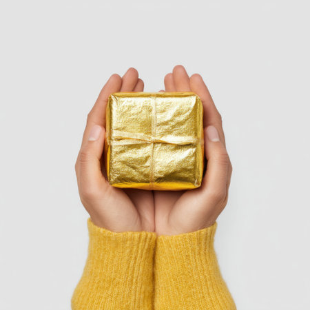 A beautifully wrapped gold gift held in hands, showcasing a shiny foil texture against a cozy yellow sweater, embodying warmth and joy of giving during special occasions.