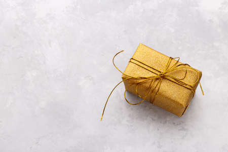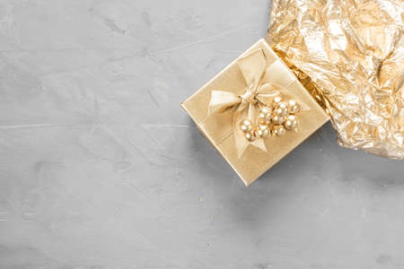 Golden gift boxe on grey stone background, copy space flat lay, Christmas or birthday presen