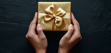 Close up of a womans hands holding a gold gift box with a bow on a black background.