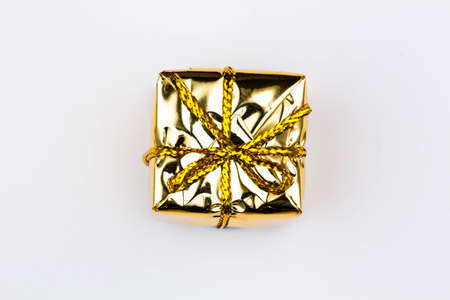 Box with gift on a white background with copy space for text. Golden boxes with gifts. Christmas gift boxes. Holidays Gifting. New Year gift boxes to family woman, man. Isolated. Top view. Close-up