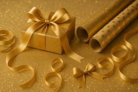 An elegant golden gift box surrounded by shiny wrapping and ribbons on a sparkly backdrop