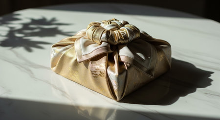 A luxurious gold gift box with a shimmering ribbon, sitting on a velvet cloth.