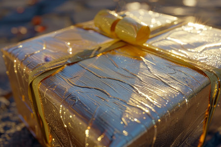 A gold wrapped gift box with a bow on top. The box is decorated with gold and silver and has a shiny appearance. Concept of luxury and celebration, as the gold wrapping