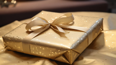 AI Generated. Beautifully wrapped gold gift box with ribbon on a glittery surface