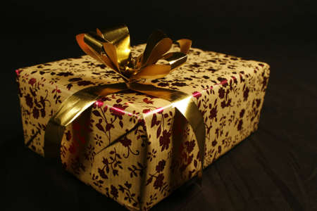 gold color box of present with red ribbon