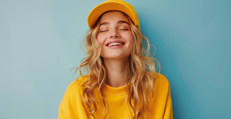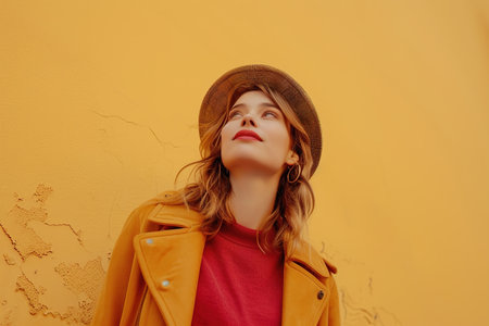 A woman wearing a yellow jacket and hat is standing in front of a yellow wall. She is smiling and looking up at the sky