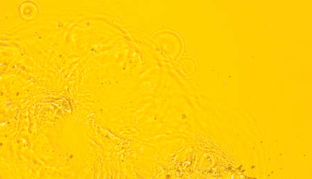 Abstract summer background. Transparent yellow clear water surface texture with ripples, splashes and bubbles. Top view