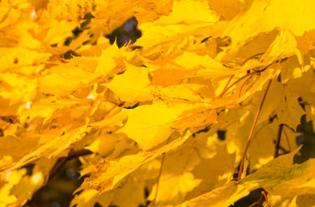Yellow autumn leaves on tree branch with sunshine on top
