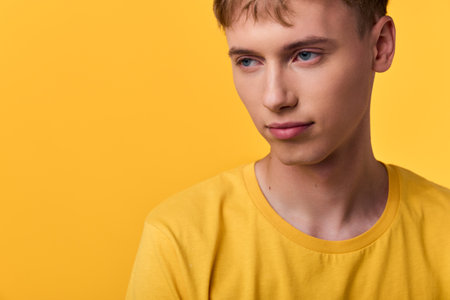 Young man wearing a yellow shirt against a bright yellow backdrop, conveying casual style, quiet contemplation, modern fashion appeal, and clean studio lighting