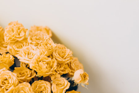 Bouquet of yellow roses on a yellow background. Copy space