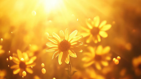 yellow flowers with the sun setting behind them, captured in the style of uhd image by chen zhen for national geographic. the dark orange and light gold hues create a mesmerizing contrast against the vibrant green foliage. this high-detailed photograph showcases accurate and luminous colors, bringing the beauty of nature to life. ai generated