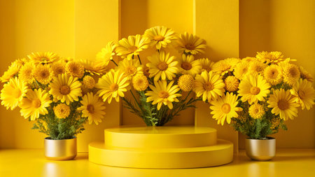 Yellow flowers in pots on yellow platform against yellow wall.