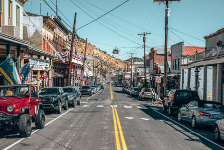 The landscape captures Virginia City in golden hour, highlighting the historic wooden structures and rolling mountains under a vibrant sky, creating a peaceful atmosphere.