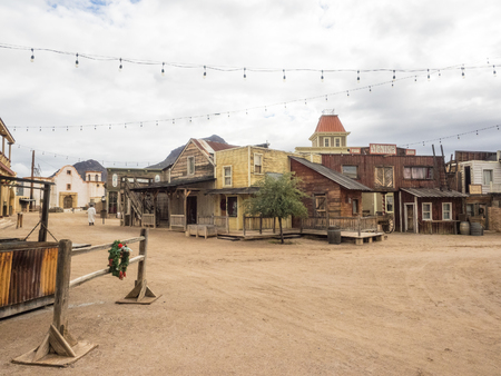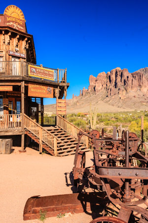 Old Wild Western Wooden Saloon in Goldfield Gold Mine Ghost Town in Youngsberg, Arizona, USA surrounded by cactuses