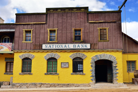SIOUX CITY, GRAN CANARIA - FEB 20, 2014: Street of wild west town with bank building in Sioux City. Popular tourist attraction in Gran Canaria island